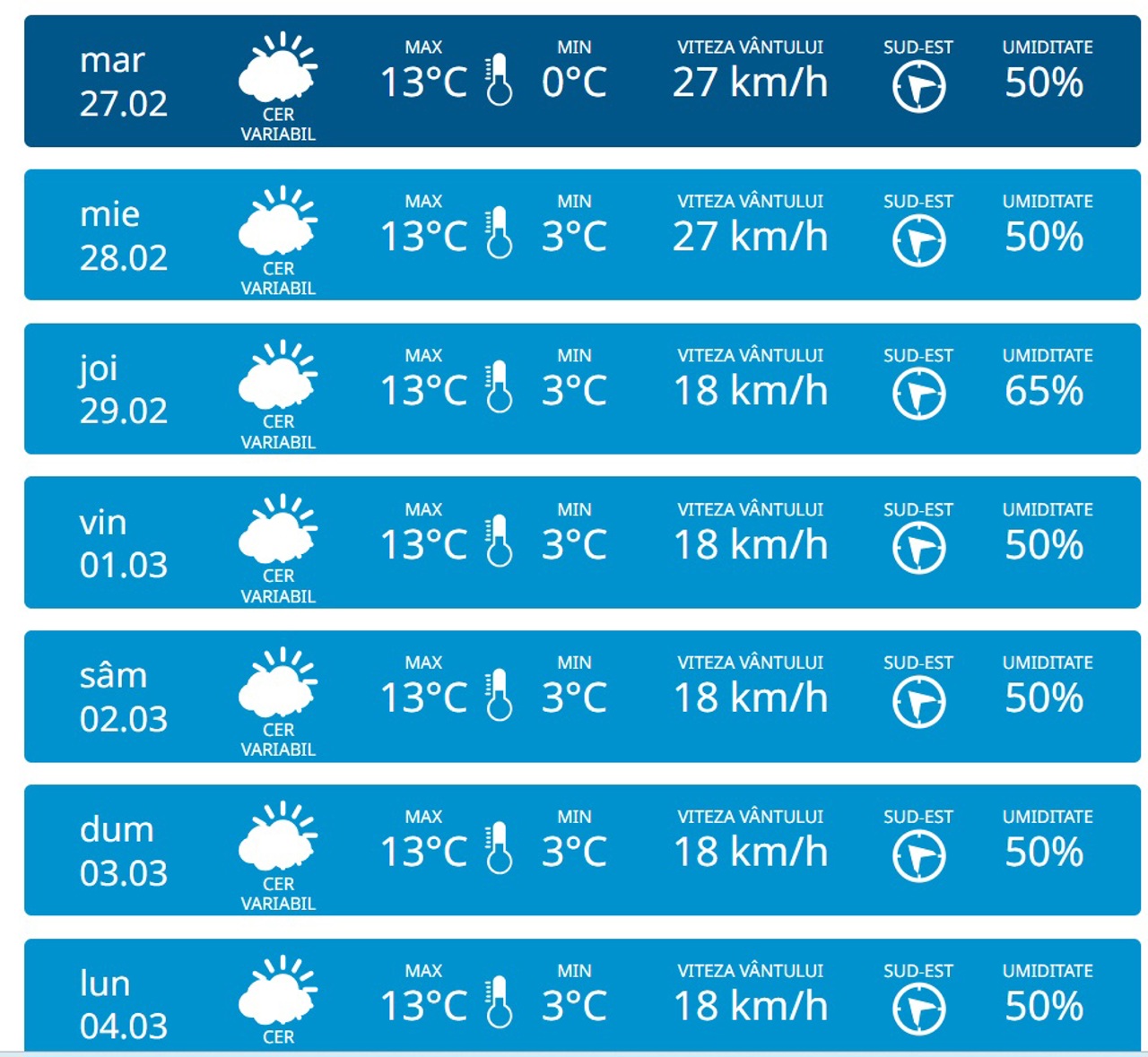 Vremea va continua să fie mai caldă decât în mod normal pentru această perioadă, în toată țara. Potrivit Serviciului Hidrometeorologic de Stat (SHS), astăzi, 27 februarie, valorile termice vor ajunge până la 15 grade Celsius, iar valorile nocturne se vor situa în medie pe țară între -2..3 grade Celsius.
