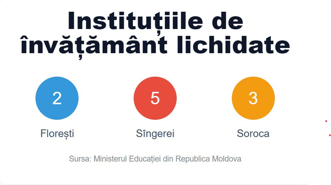 В Сорокском районе будут закрыты три учебных заведения: начальная школа в Парканах, начальная школа в Околине и теоретический лицей «Ион Крянгэ». В Флорештском районе будут ликвидированы начальные школы в Думитренах и Ченуше.