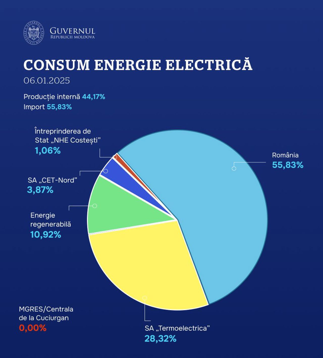 Astfel, pe 6 ianuarie, energia a fost furnizată din mai multe surse, inclusiv SA „Termoelectrica” (28,31%), SA „CET-Nord” (3,87%), ÎS „NHE Costești” (1,06%), energie regenerabilă (10,92%) și importuri din România (55,83%).