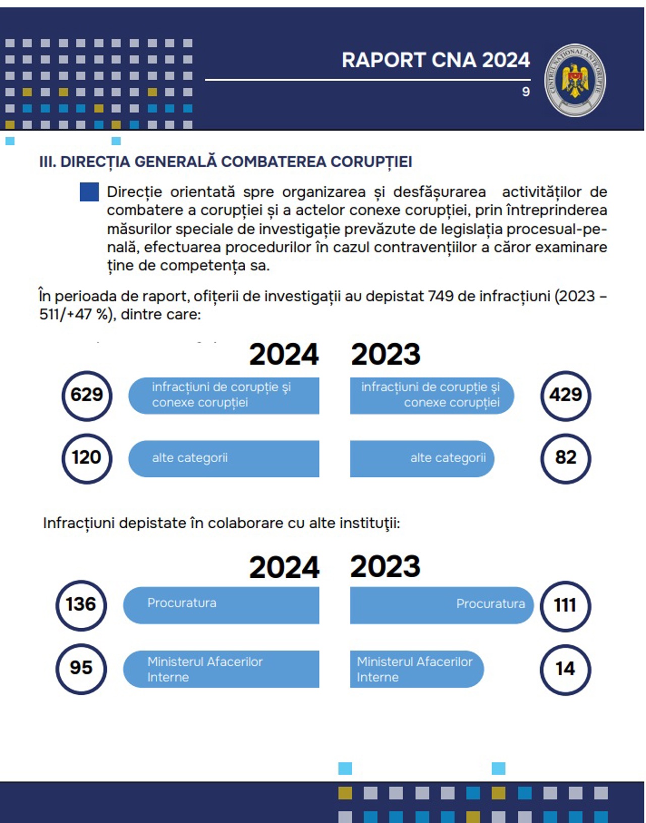 Circa 750 de infracțiuni de corupție au fost depistate în 2024 de către ofițerii Centrului Național Anticorupție (CNA), în creștere cu 47% față de anul precedent. Potrivit raportului anual al instituției, cele mai multe cazuri au fost documentate în municipiul Chișinău – 323, urmat de Bălți cu 71 și Soroca - 44.
