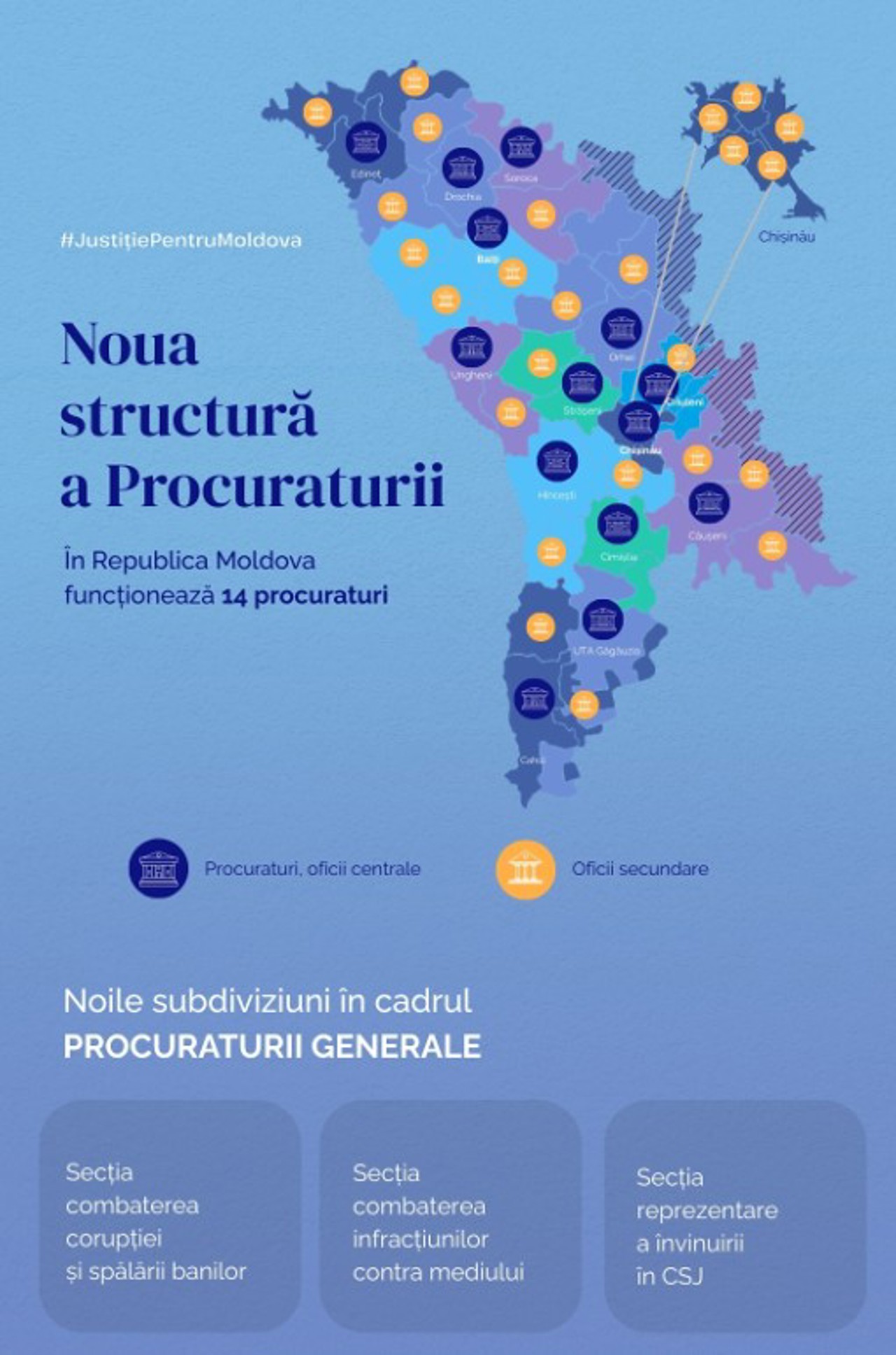 Procuratura Generală a Republicii Moldova a publicat noua hartă a procuraturilor teritoriale, care prevede reducerea numărului acestora de la 36 la 14 unități.