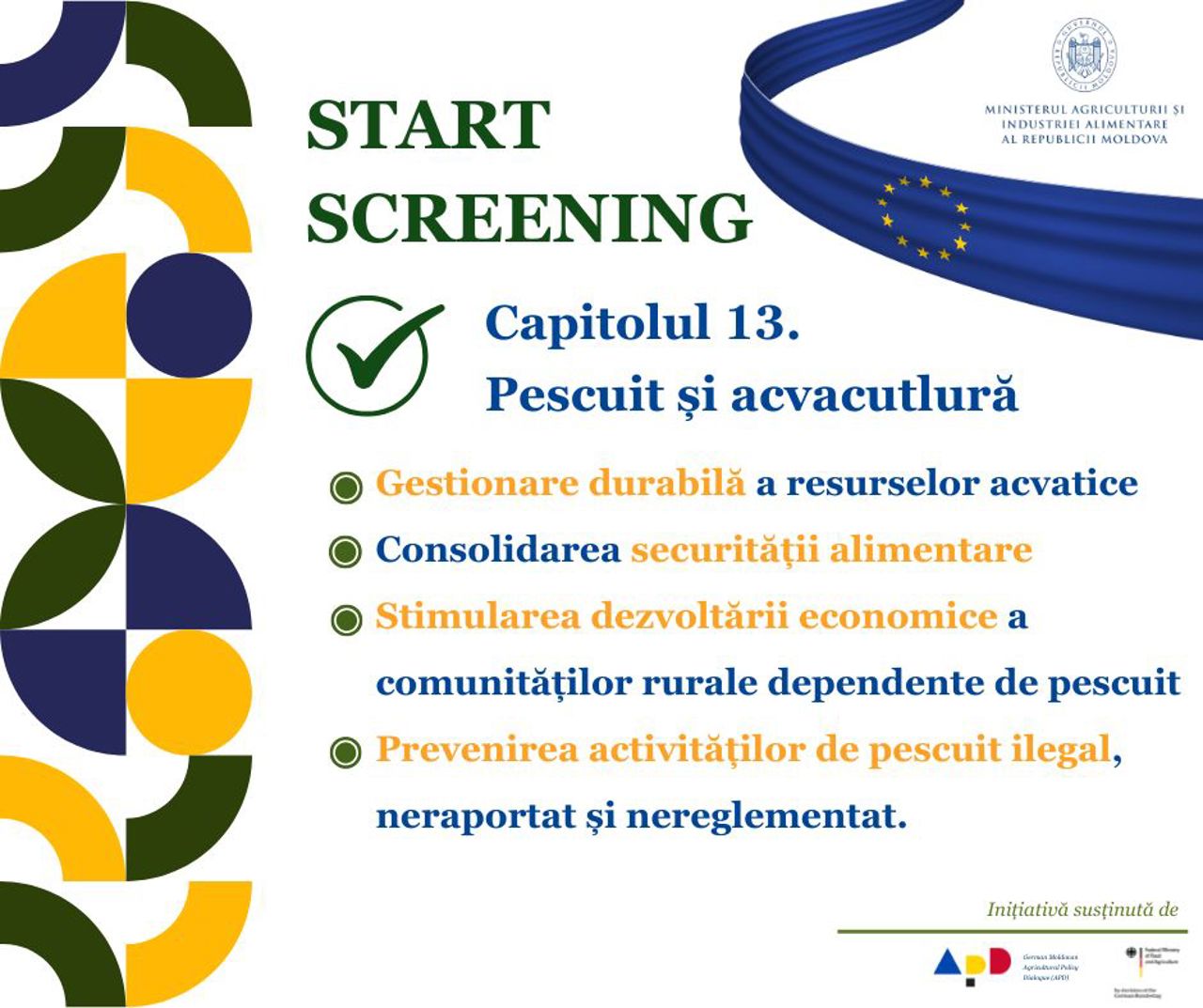 Primul capitol analizat în cadrul acestor sesiuni este Capitolul 13 – Pescuit și acvacultură, considerat strategic pentru angajamentul Republicii Moldova privind gestionarea durabilă a resurselor acvatice, consolidarea securității alimentare și stimularea dezvoltării economice în comunitățile rurale dependente de acest sector. De asemenea, sunt vizate alinierea la reglementările pieței comune europene și combaterea pescuitului ilegal.