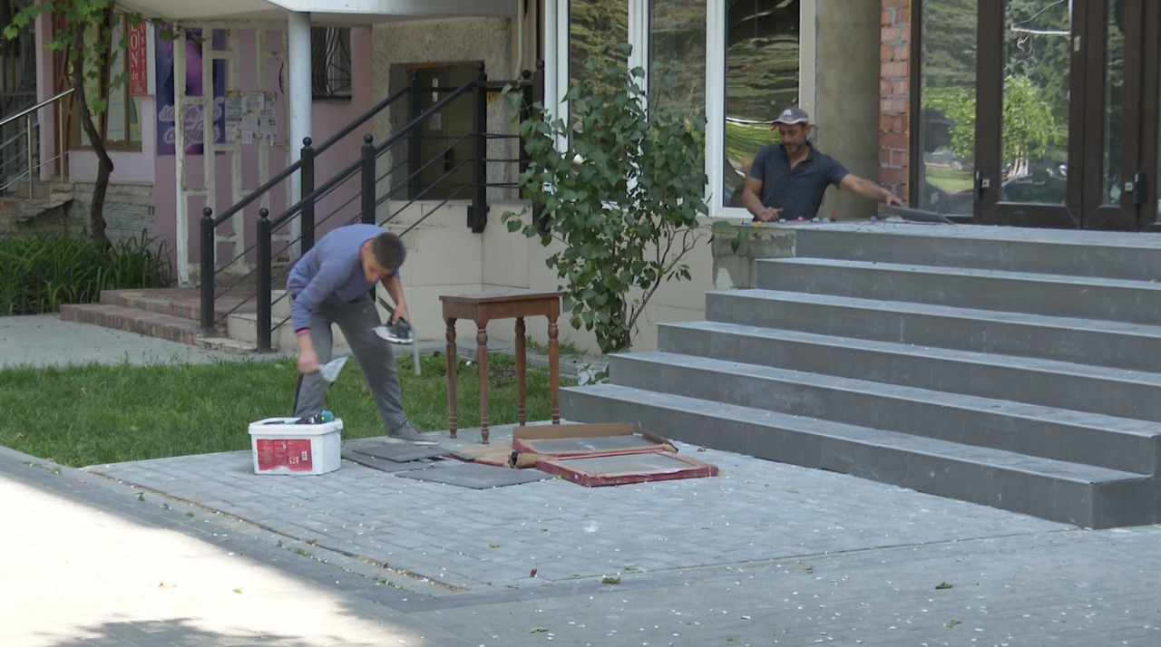 Echipa de filmare M1 a surprins câțiva muncitori care puneau pavajul la intrare. Când au văzut camera, au făcut câteva apeluri și apoi și-au strâns lucrurile.