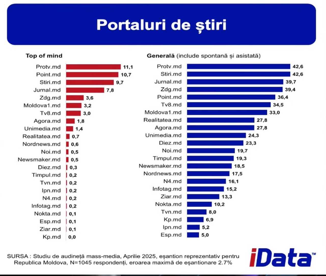 Moldovenii aleg să se informeze online în special de pe Protv.md, Stiri.md și Point.md. Moldova1.md, site-ul de știri al postului public, se află în top 10 portaluri de știri din țară. Alte portaluri cu acces ridicat sunt Jurnal.md, Zdg.md și Tv8.md, iar la coada clasamentului se află site-uri locale sau de nișă, folosite ocazional.
