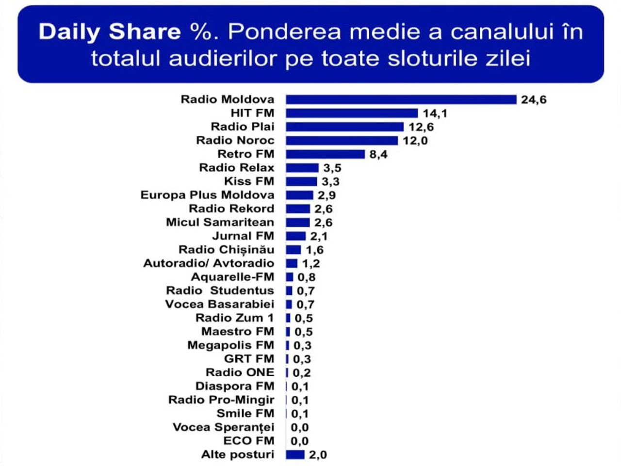 Dintre posturile de radio, în topul preferințelor este Radio Moldova, care domină piața: cu un Daily Share de 24,6%, depășește HIT FM (14,1%), Radio Plai (12,6%) și Radio Noroc (12%).