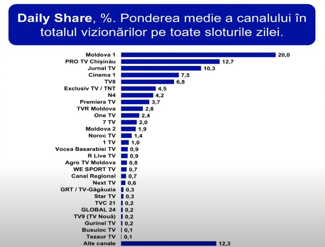 Moldova 1 este cel mai urmărit post TV la nivel național, cu o cotă medie de audiență zilnică (Daily Share) de 20%. PRO TV Chișinău (12,7%) și Jurnal TV (10,3%) urmează pe locurile doi și trei.