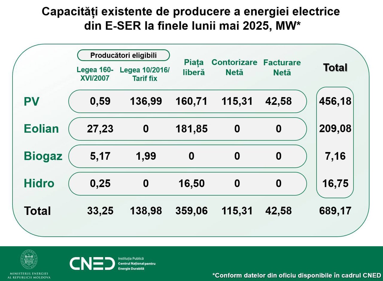 Republica Moldova face pași tot mai hotărâți spre independență energetică și sustenabilitate. Până la sfârșitul lunii mai 2025, capacitatea totală de producere a energiei electrice din surse regenerabile a atins un nivel-record de 689,17 MW, în creștere cu peste 100 MW față de finalul anului trecut, arată datele Centrului Național pentru Energie Durabilă.
