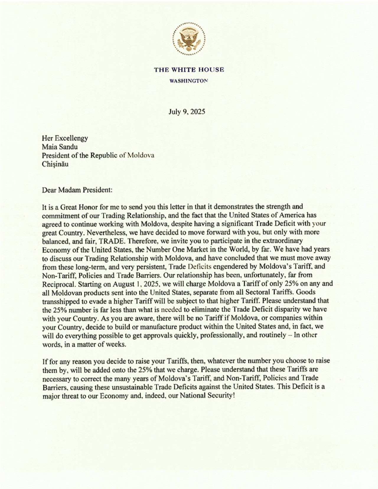 Potrivit scrisorii semnate de Trump, Statele Unite vor aplica un tarif de 25% pentru toate produsele moldovenești exportate în SUA. Măsura este motivată de un „deficit comercial semnificativ” pe care SUA îl are cu Republica Moldova, iar Trump susține că relația comercială bilaterală „a fost, din păcate, departe de a fi reciprocă”.
