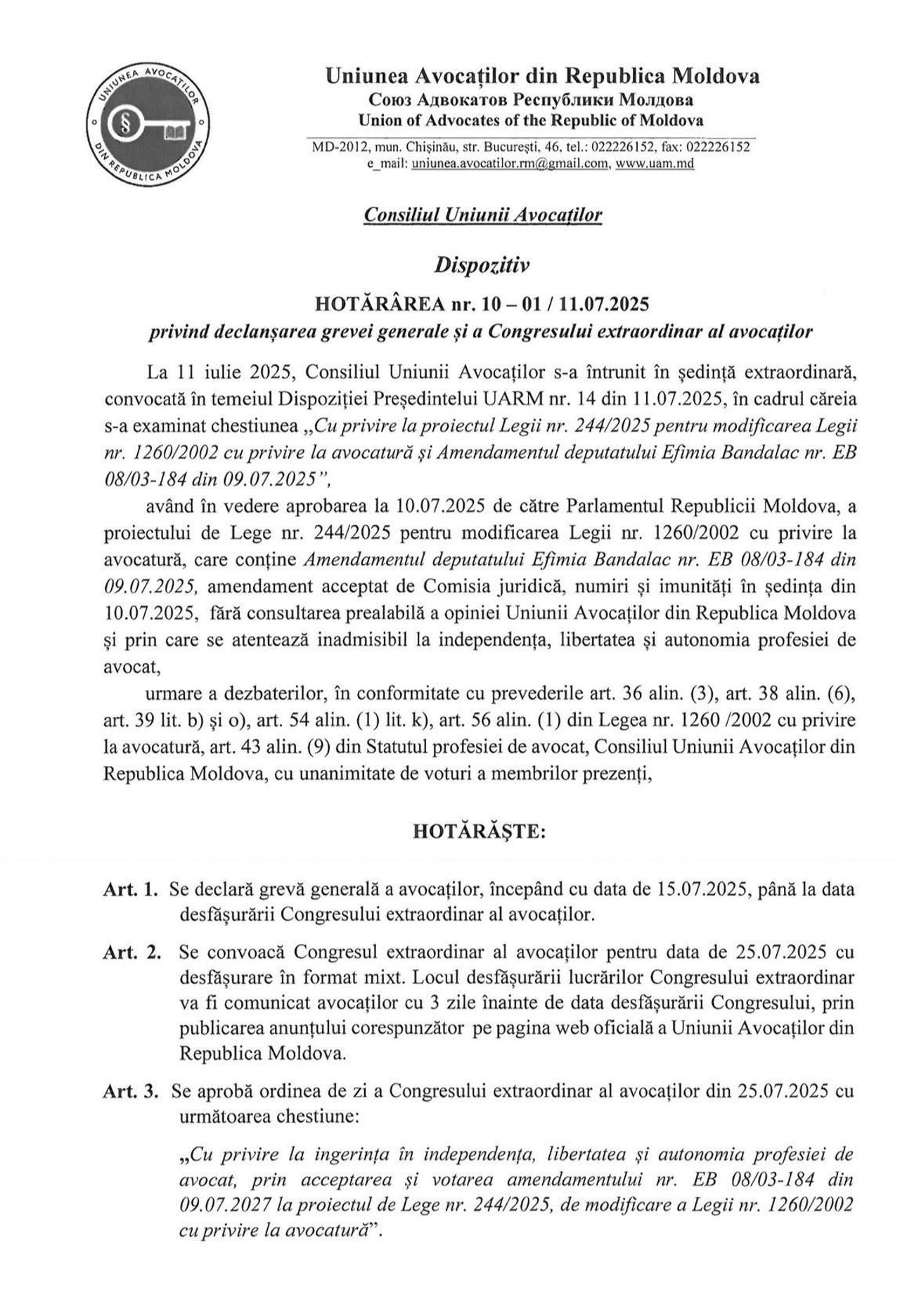 Uniunea Avocaților din R. Moldova (UARM) anunță o grevă generală de zece zile, din data de 15 iulie, ca răspuns la modificările legislative adoptate recent de Parlament. Președintele Uniunii, Dorin Popescu, denunță un atac fără precedent asupra independenței și autonomiei profesiei de avocat. Acesta susține că amendamentele au fost votate fără consultarea avocaților și fără respectarea procedurilor legale. În schimb, Efimia Bandalac, autoarea amendamentelor și membră a Comisiei juridice, numiri și imunități, afirmă că modificările nu afectează dreptul avocatului de a-și exercita liber profesia.