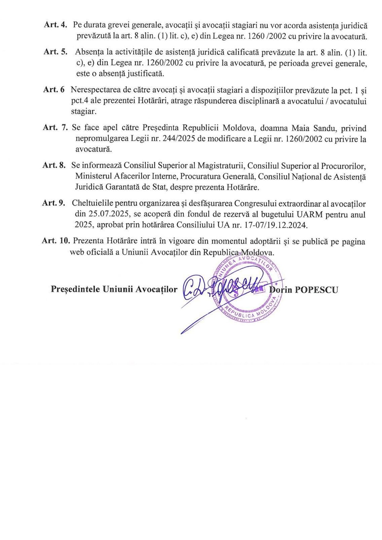 „Consiliul a decis că toți avocații intră în grevă generală din data de 15 iulie, până la 25 iulie când se convoacă Congresul extraordinar. Solicităm șefei statului să nu promulge legea”, a spus președintele Uniunii Avocaților din R. Moldova.