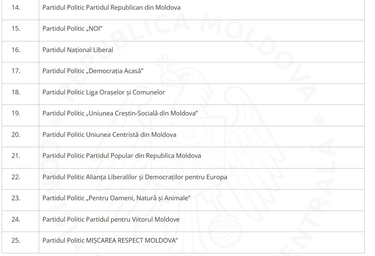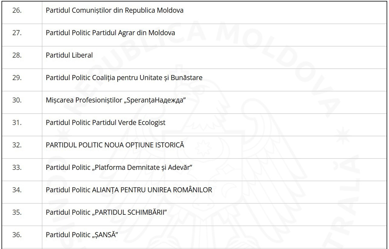 В то же время ЦИК сообщает, что запросы 14 других партий находятся на рассмотрении АГУ. В их числе — Партия коммунистов, Либеральная партия, Платформа DA, «Альянс за объединение румын» (AUR) и другие.