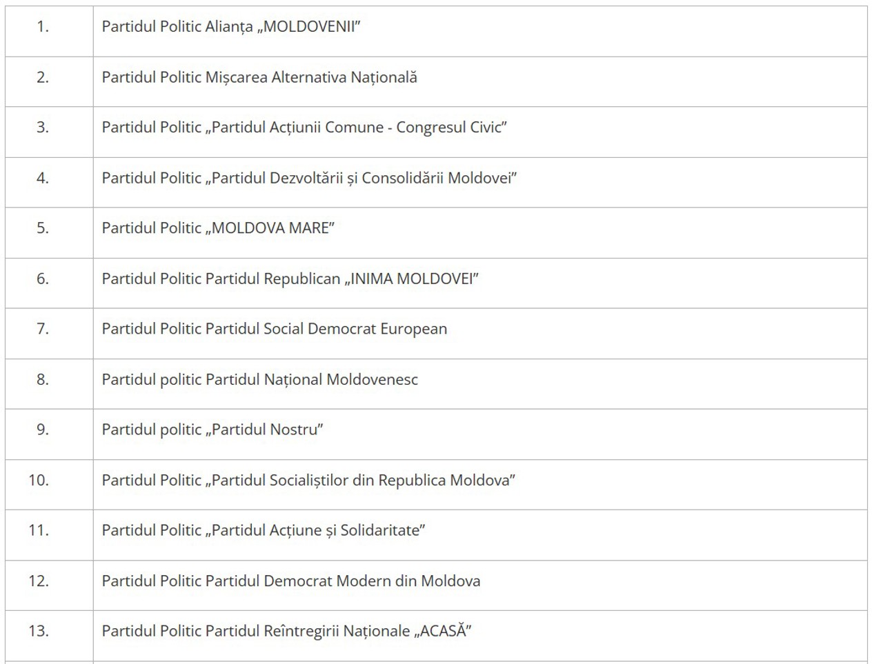 В случае трех политических партий: «Шанс», «Альтернатива и Сила спасения Молдовы» и «RENAȘTERE», упоминается, что в судах находятся споры об ограничении их деятельности или роспуске.