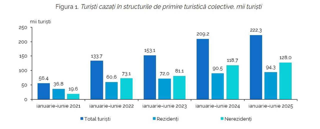 According to official figures for the first half of 2025, 94,300 of the 222,300 accommodated tourists were Moldovan, while 128,000 were foreign. Most tourists chose hotels, motels, agrotourist guesthouses and health spas.