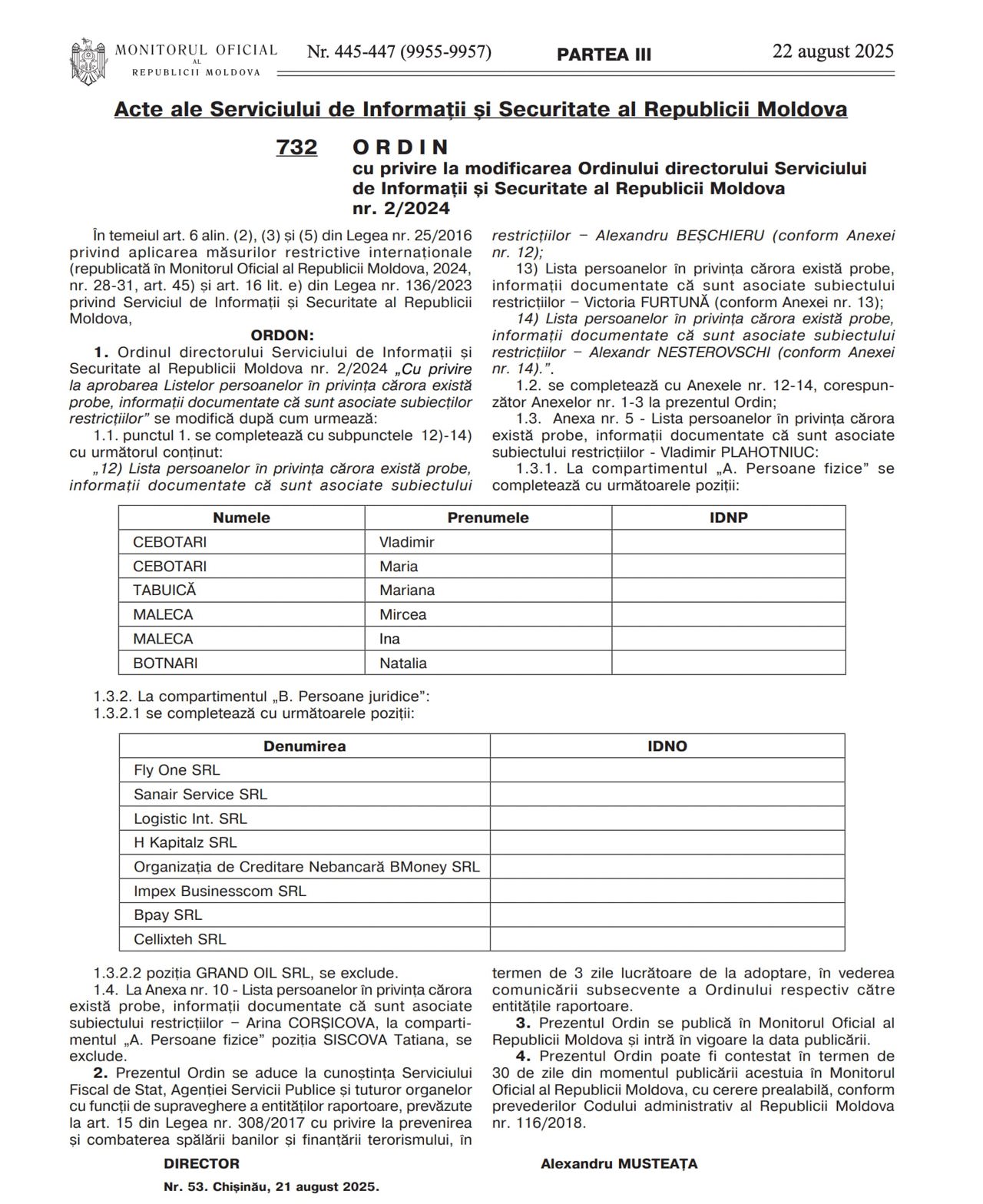 Totodată, în listă se regăsesc și companiile Fly One SRL, Sanair Service SRL, Logistic Int. SRL, H Kapitalz SRL, Organizația de Creditare Nebancară BMoney SRL, Impex Businesscom SRL, Bpay SRL, Cellixteh SRL.