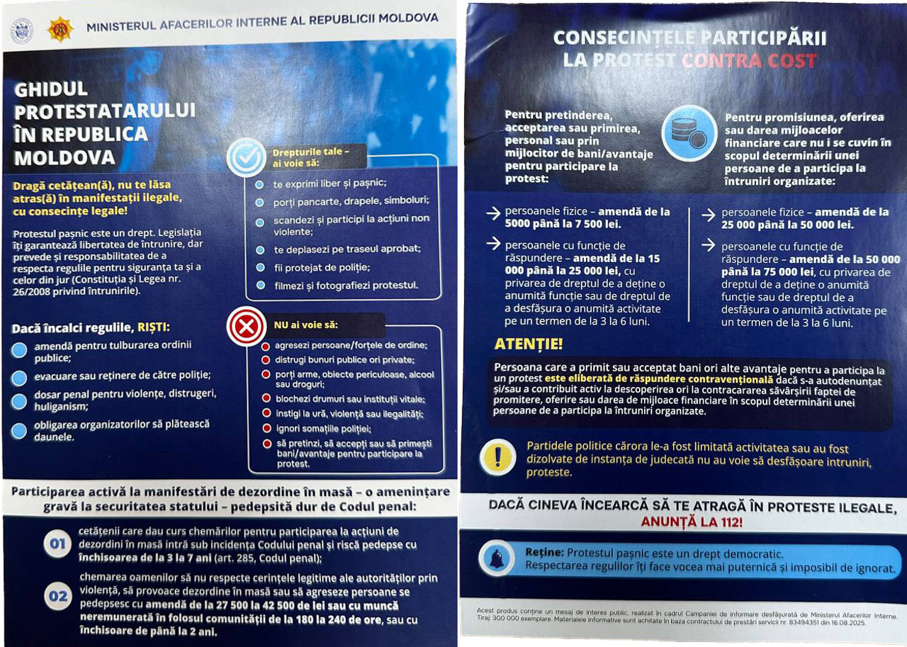 Cetățenii R. Moldova au dreptul să protesteze și să-și exprime liber voința, însă pot fi sancționați atunci când acceptă să fie plătiți pentru a manifesta sau să participe la destabilizări. În contextul intensificării protestelor plătite, organizate pe teritoriul R. Moldova, Ministerul Afacerilor Interne (MAI) a lansat „Ghidul protestatarului în Republica Moldova” prin intermediul căruia cetățenii pot afla ce drepturi au și care sunt sancțiunile prevăzute de lege pentru acțiuni ilegale.