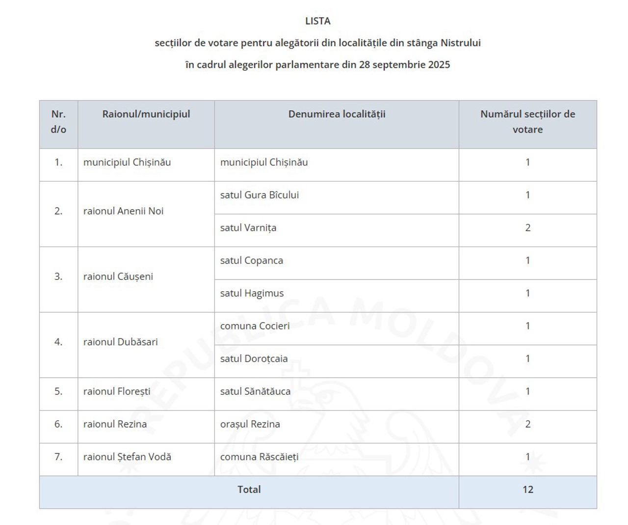 Comisia Electorală Centrală a decis, pe 24 august curent, să organizeze 12 secții electorale pentru cetățenii R. Moldova cu drept de vot domiciliați în localitățile din stânga Nistrului, precum și alegătorii domiciliați în raza circumscripției electorale municipale Bender (Tighina) și în comuna Chițcani, satele Cremenciug și Gâsca din raionul Căușeni, aflate provizoriu în afara controlului Chișinăului.