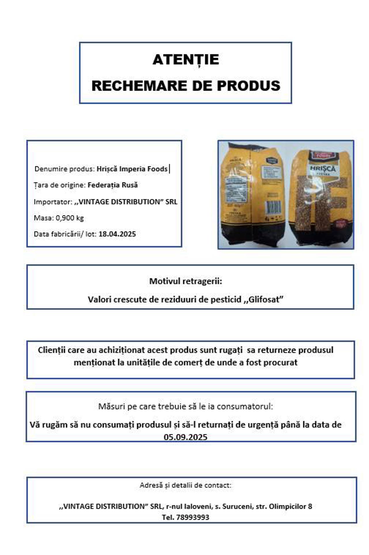 Consumatorii din R. Moldova sunt sfătuiți să returneze de urgență hrișca de marca „Imperia Foods”, importată din Federația Rusă. Agenția Națională pentru Siguranța Alimentelor (ANSA) a anunțat retragerea din comerț a unui lot al acestui produs, după ce au fost identificate niveluri ridicate de reziduuri de pesticid „Glifosat”.