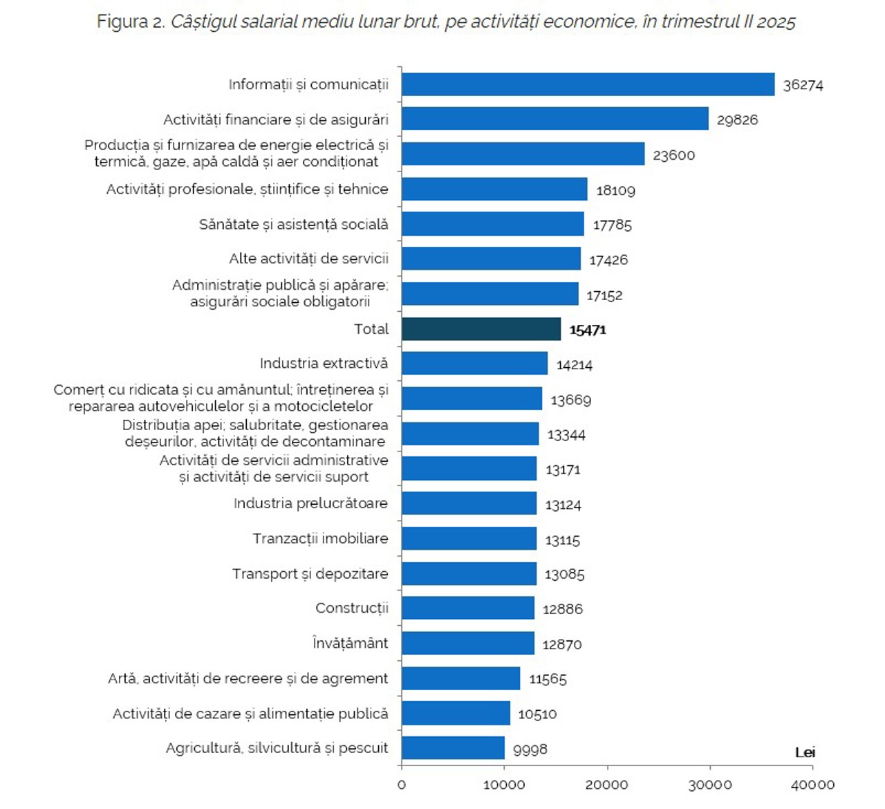 Cele mai mari salarii au fost în domeniul informații și comunicații – în medie câte 36.274 de lei pe lună, în top urmând activitățile financiare și de asigurări – 29.825 de lei și producția și furnizarea de energie electrică și termică, gaze, apă caldă și aer condiționat – în medie câte 23.599 de lei.
