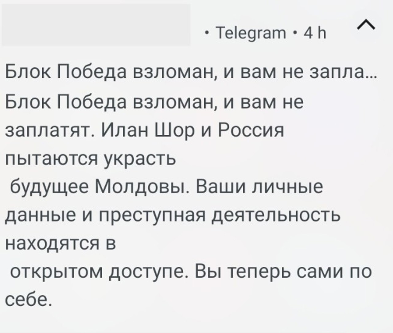 Menționăm că pe mai multe canale de pe Telegram asociate grupării Șor a apărut astăzi un mesaj unic: „Blocul Victorie a fost spart și n-o să mai fiți plătiți. Ilan Șor și Rusia încearcă să fure viitorul R. Moldova. Datele voastre personale și activitatea criminală sunt publice pentru toți. Acum sunteți pe cont propriu”.