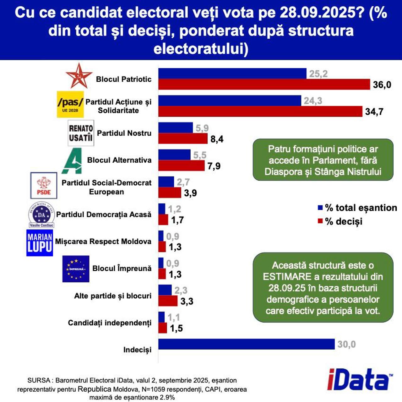 Potrivit cercetării, Blocul Electoral Patriotic al Socialiștilor, Comuniștilor, Inima și Viitorul Moldovei ar acumula 25,2% din voturi, fiind urmat de Partidul Acțiune și Solidaritate (PAS), cu 24,3%.