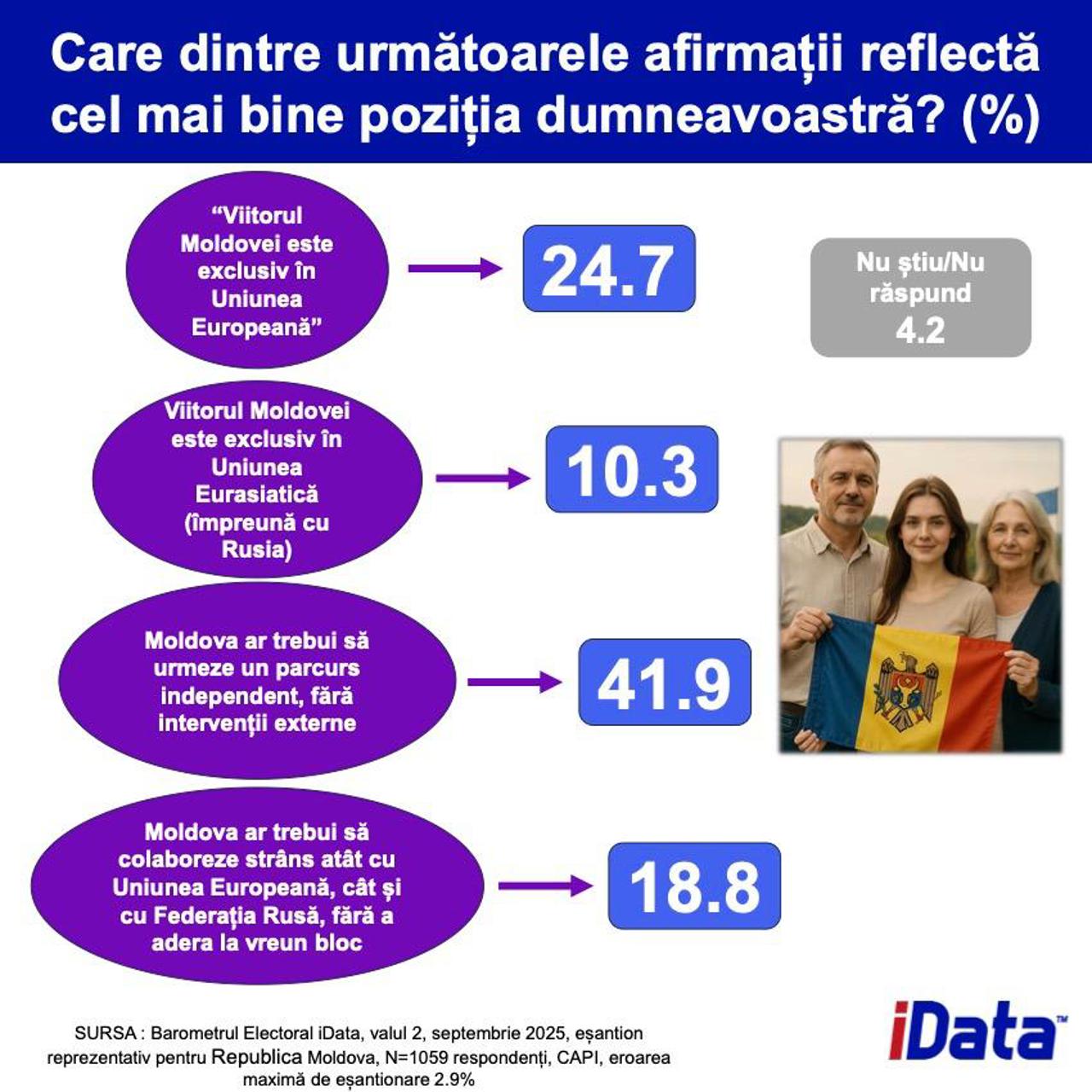 Sondajul a fost realizat de iData prin metoda CAPI (față în față), în perioada 20 august - 3 septembrie 2025, pe un eșantion de 1.059 de persoane. Marja maximă de eroare este de ±2,9%.