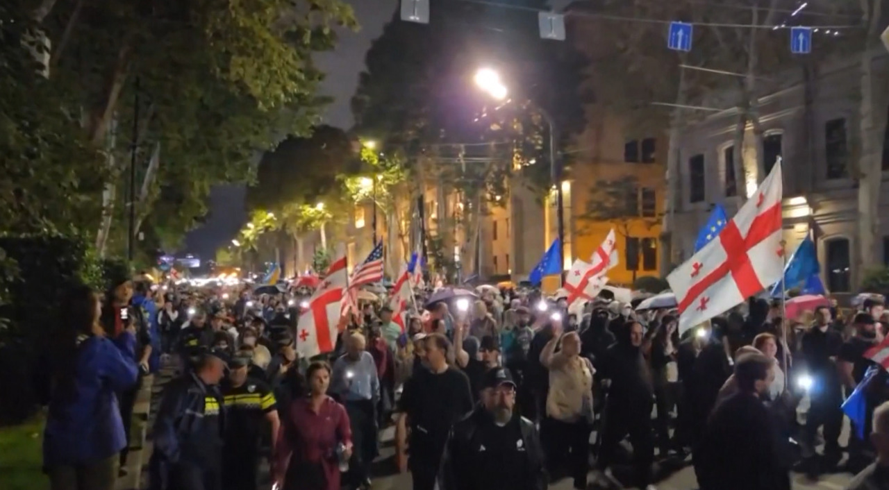 Cu steagurile Georgiei și ale Uniunii Europene, oamenii au mers pe străzile orașului Tbilisi și au scandat lozinci anti-Rusia. Protestatarii nu s-au împrăștiat nici după ce a început ploaia.