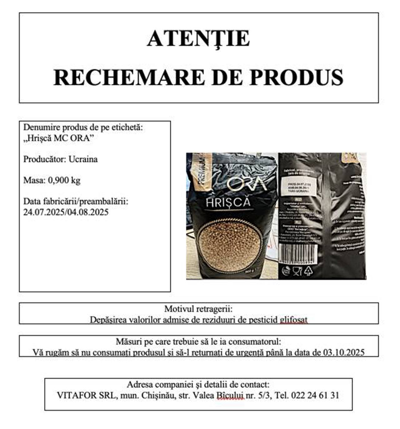 Consumatorii din R. Moldova sunt atenționați să nu consume hrișca ce are inscripția „ORA” pe ambalaj și data fabricării/ preambalării: 24.07.2025/ 04.08.2025. Agenția Națională pentru Siguranța Alimentelor (ANSA) a anunțat retragerea de pe piață a acestui lot contaminat cu pesticide.
