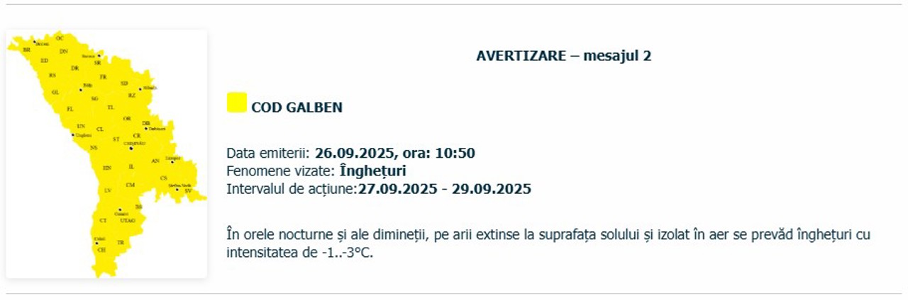 Serviciul Hidrometeorologic de Stat (SHS) a emis vineri, 26 septembrie, o avertizare meteorologică de Cod galben de înghețuri, valabilă în perioada 27–29 septembrie, pe întreg teritoriul Republicii Moldova.