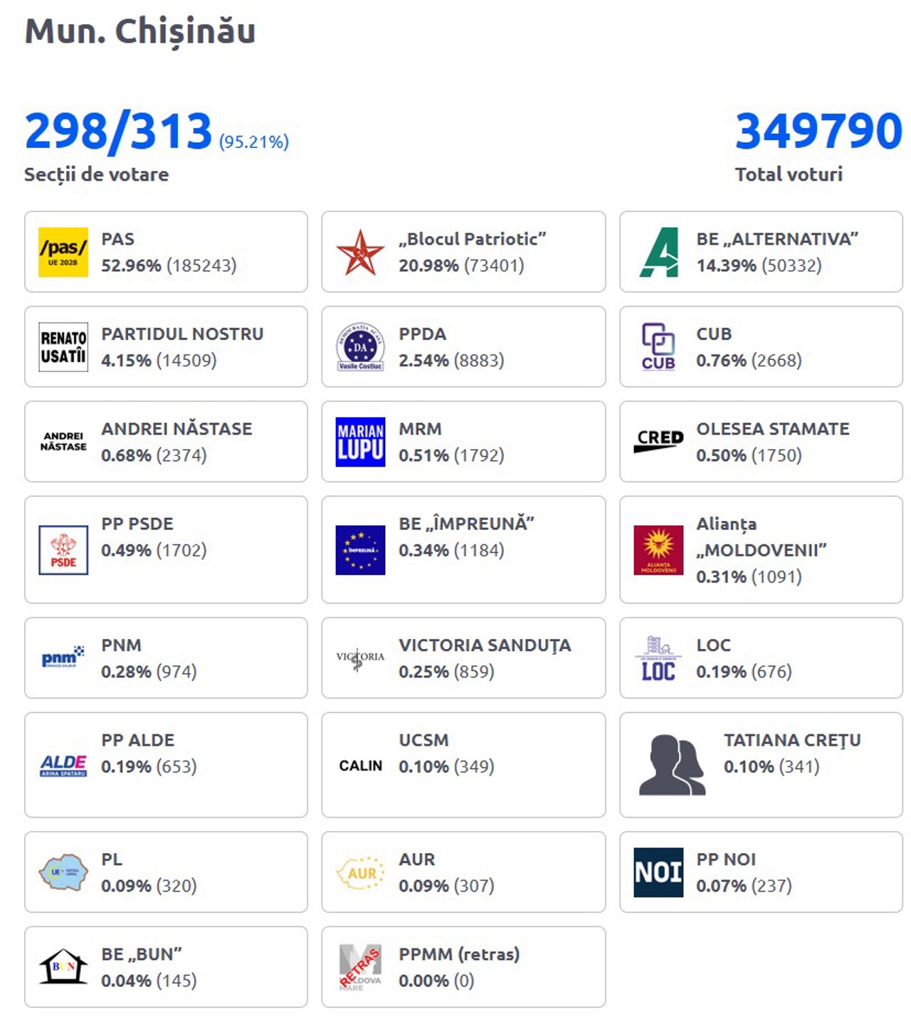 Vot preliminar în Chișinău: PAS - 52.96%; BEP - 20.98%; „Alternativa” - 14.39%