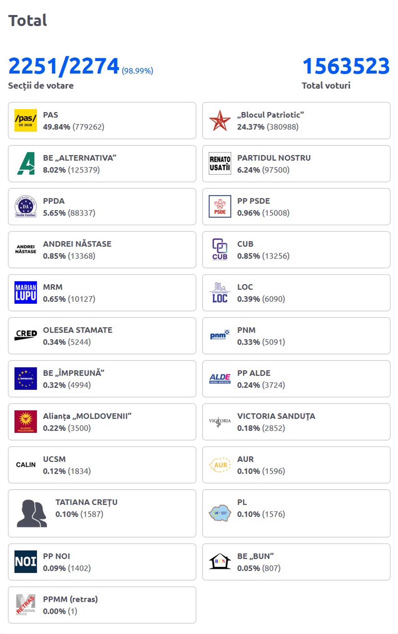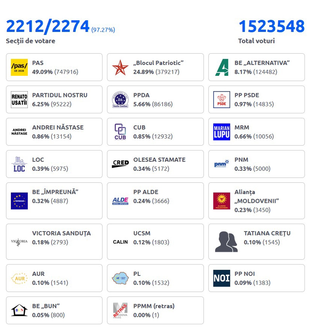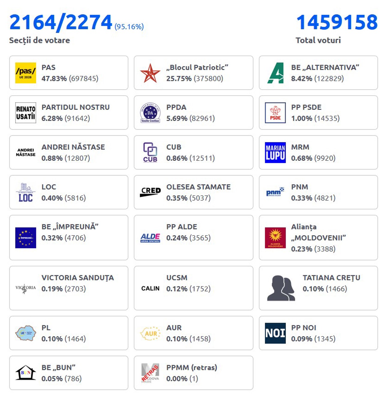 PARLAMENTARE 2025 | REZULTATE PRELIMINARE FINALE: PAS - 50.2%, Blocul „Patriotic” - 24.17%, „Alternativa” - 7.96%, PN - 6.2% și PPDA - 5.62%