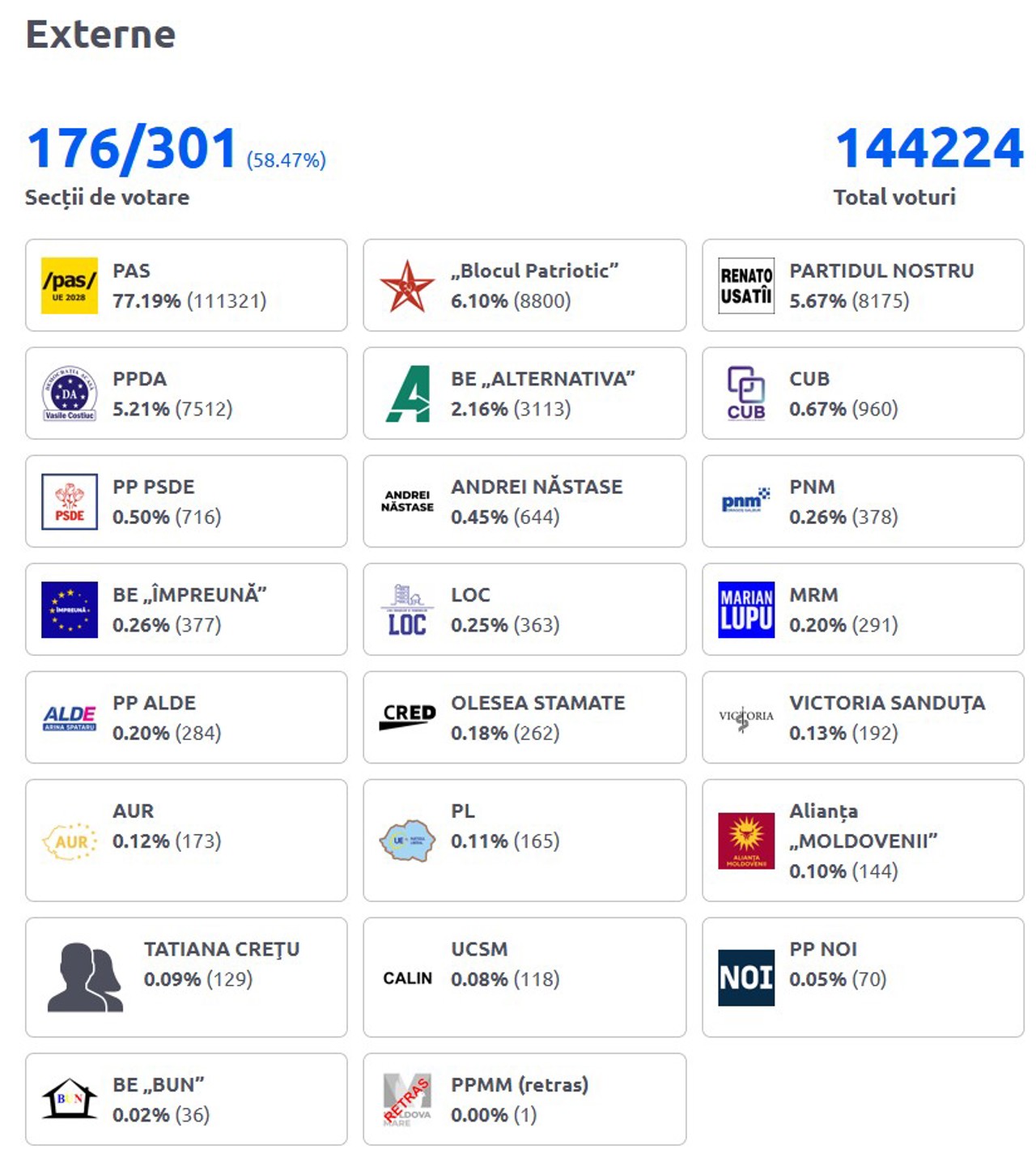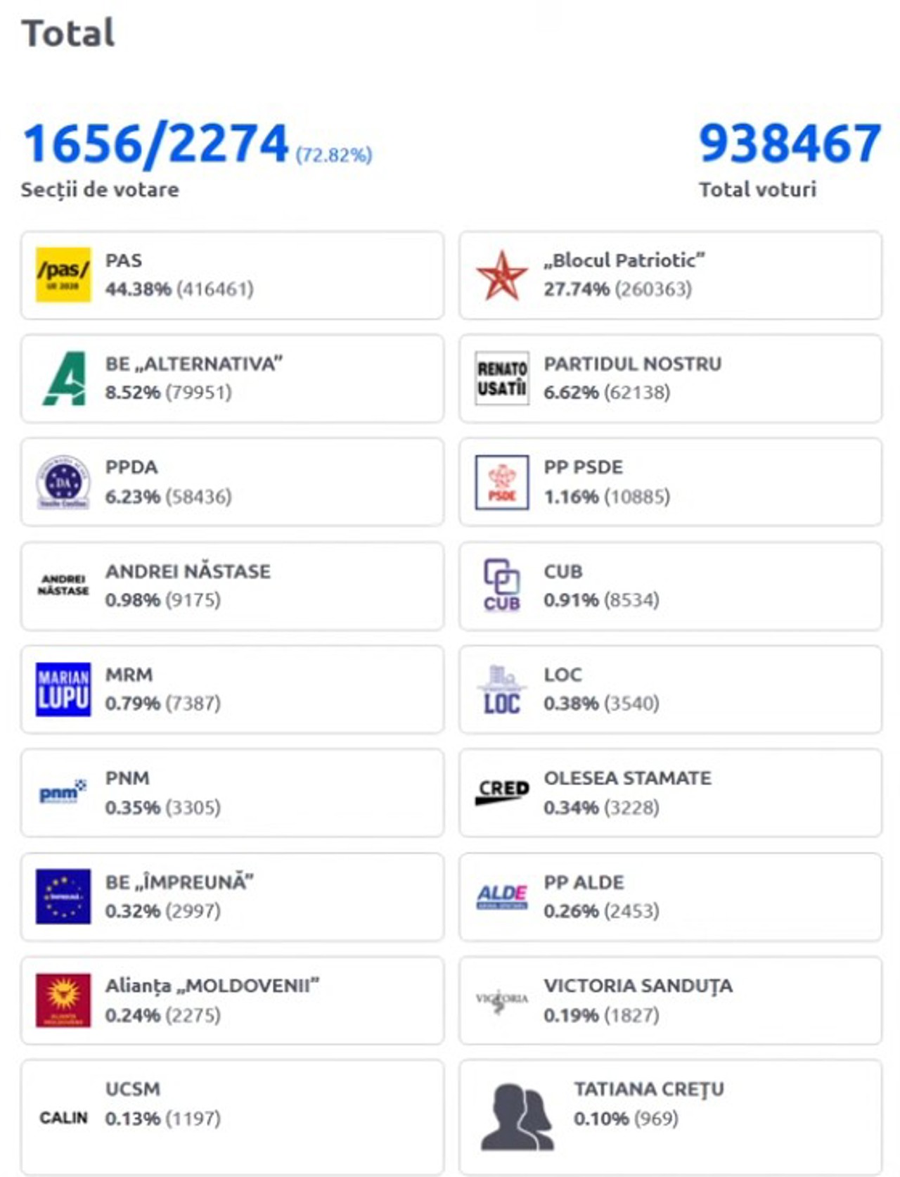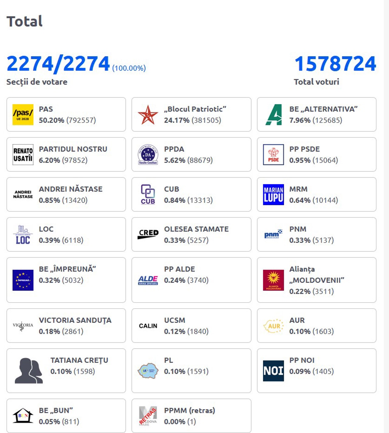 PARLAMENTARE 2025 | REZULTATE PRELIMINARE FINALE: PAS - 50.2%, Blocul „Patriotic” - 24.17%, „Alternativa” - 7.96%, PN - 6.2% și PPDA - 5.62%