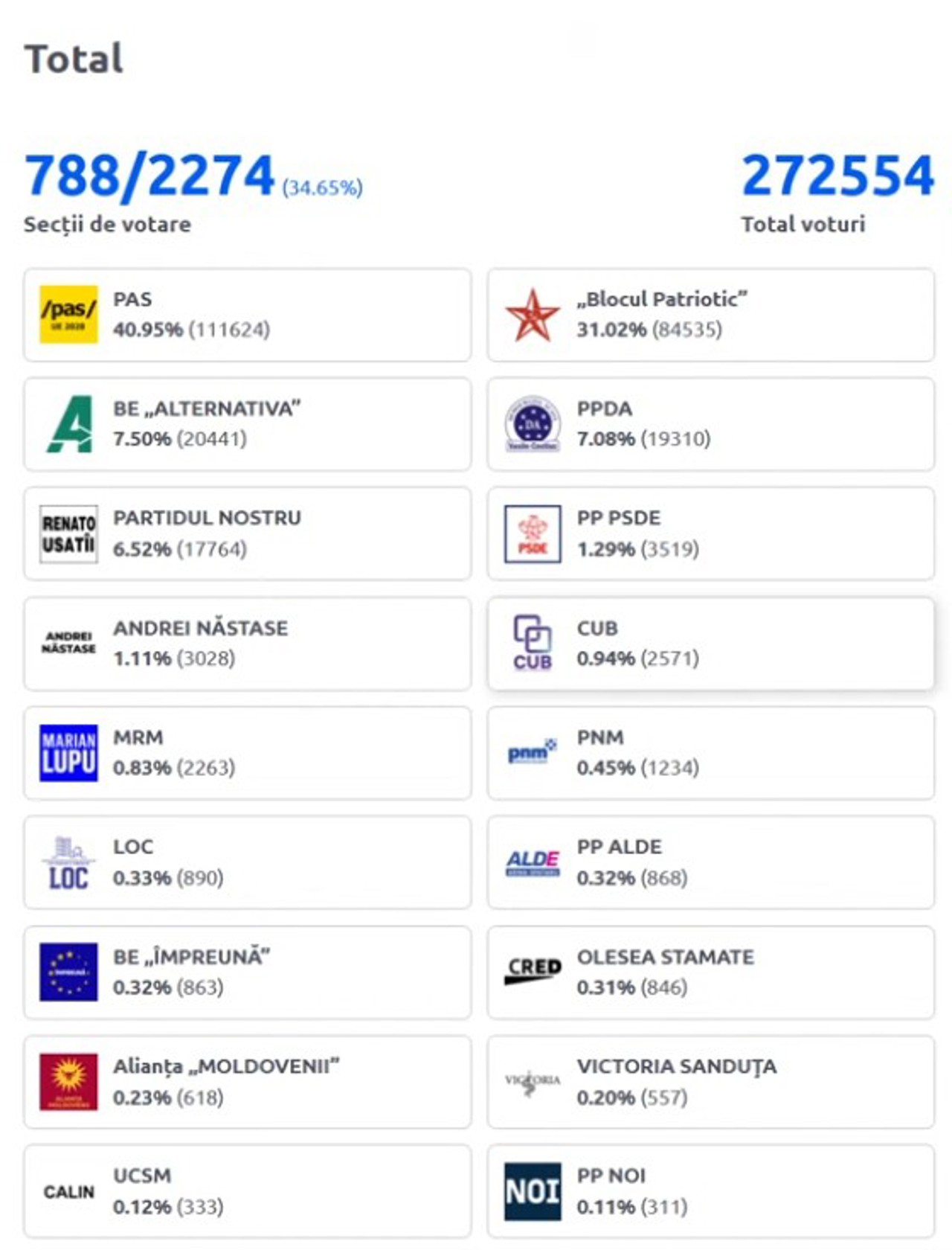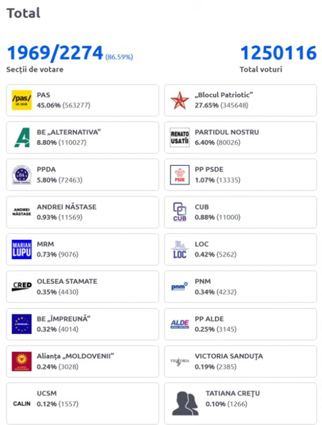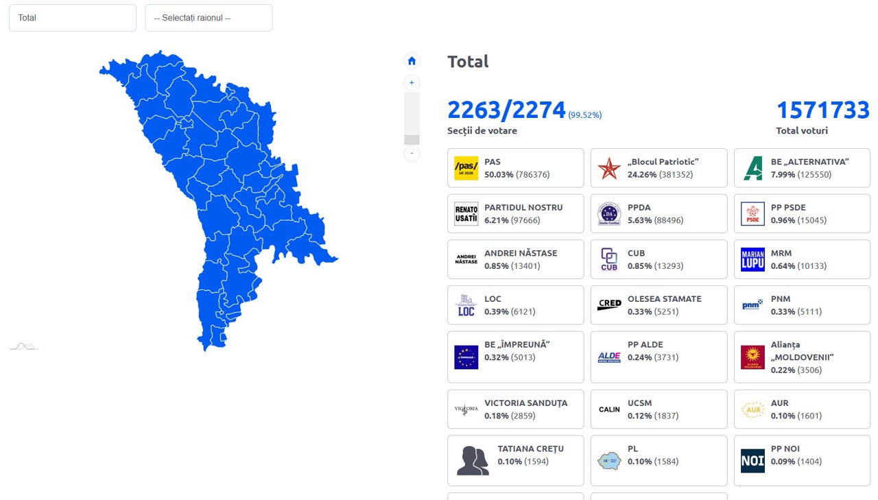 Partidul Acțiune și Solidaritate (PAS) a acumulat 50.03% din voturi la alegerile parlamentare din 28 septembrie, potrivit rezultatelor preliminare prezentate de Comisia Electorală Centrală după centralizarea datelor din 99.52% de procese-verbale.