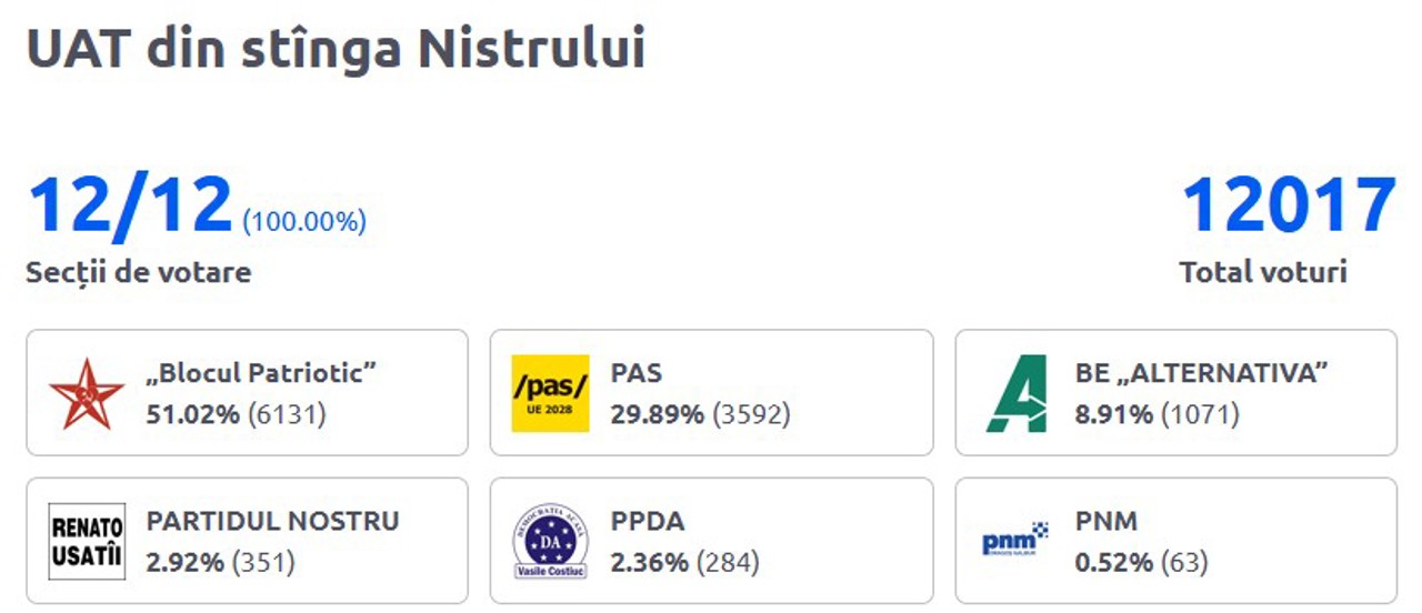 Din cei aproximativ 12 mii de alegători din stânga Nistrului, majoritatea au votat Blocul „Patriotic” (51%), PAS obținând aproape 30%. Este o creștere față de 2021, când PAS obținea doar 13.29% de voturi din partea alegătorilor din regiunea transnistreană, iar majoritatea de peste 60% revenea BECS.