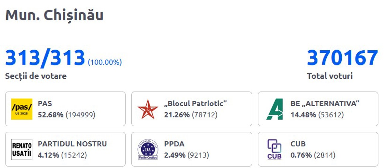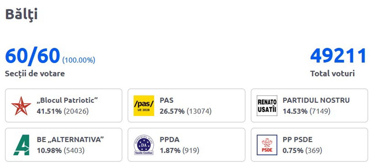 În municipiul Bălți, al doilea oraș ca mărime al țării, Blocul „Patriotic” a condus cu peste 41%, în timp ce PAS a rămas la 26%.