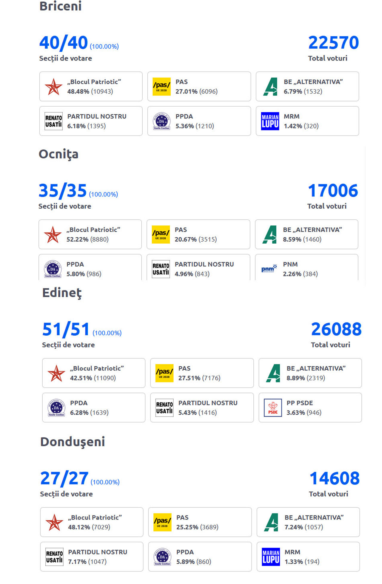 Blocul Patriotic a câștigat majoritatea voturilor în raioane ca Briceni, Ocnița, Edineț și Dondușeni, cu scoruri între 42 și 52%, repetând în mare parte rezultatul alegerilor din 2021, când Blocul Electoral al Comuniștilor și Socialiștilor (BECS) obținea acolo peste 60%.