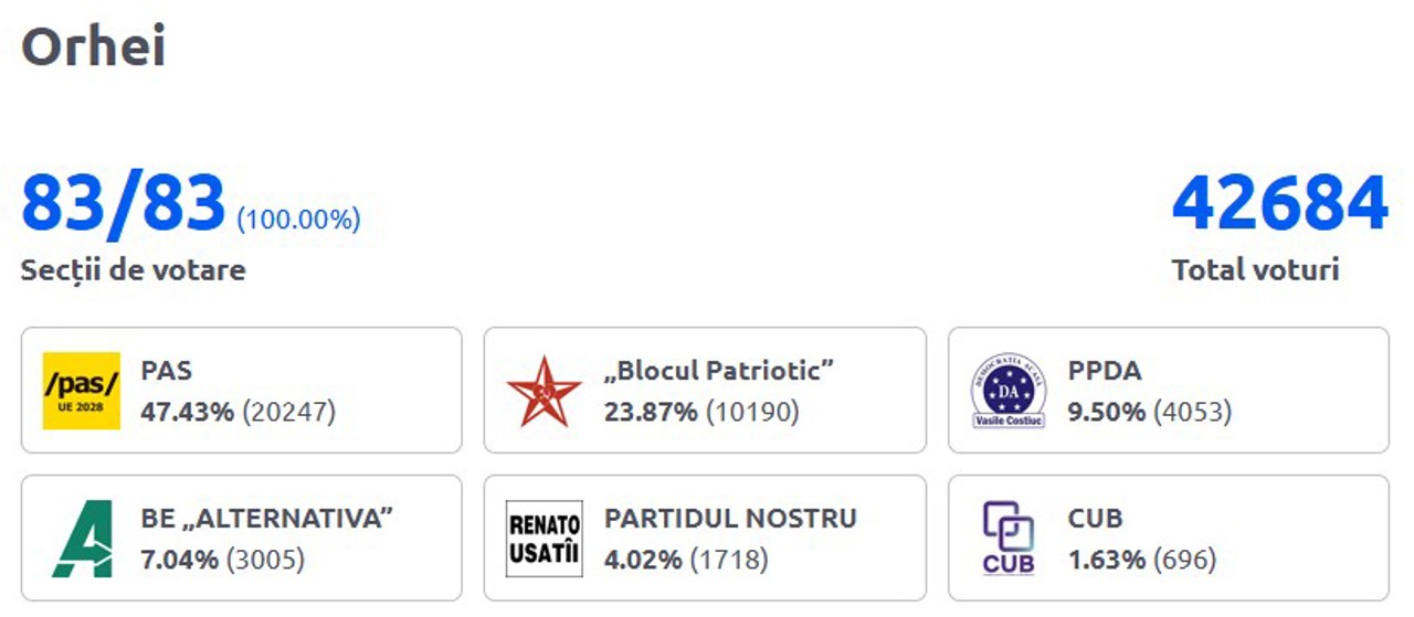 La Orhei, dominat în 2021 de partidul declarat ulterior neconstituțional „Șor”, PAS a câștigat la alegerile de duminică aproape jumătate din voturi.