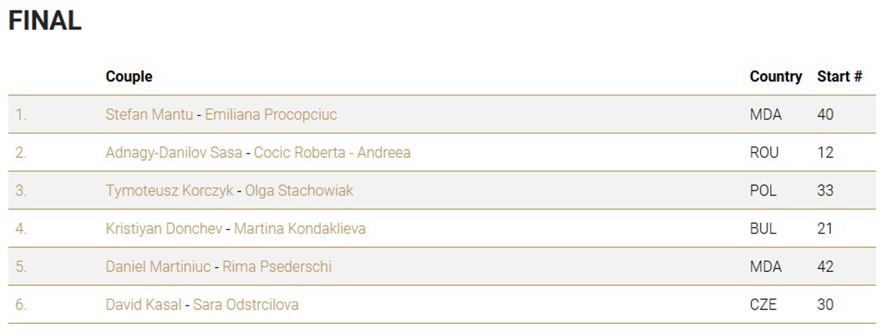 Locul al II-lea a fost ocupat de perechea Sașa Adnagy-Danilov și Roberta-Andreea Cocic din România, iar locul al III-lea a revenit reprezentanților Poloniei, Korczyk Tymoteusz și Olga Stachowiak.