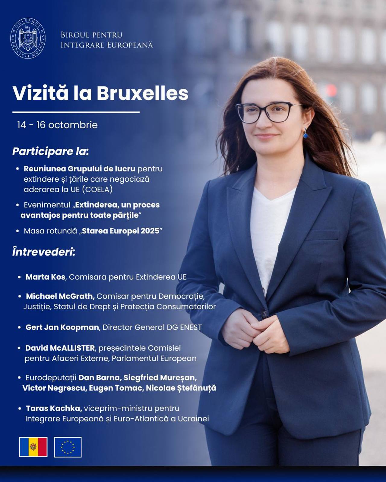 Agenda vizitei include participarea la Reuniunea Grupului de lucru pentru extindere și țările care negociază aderarea la UE (COELA), la evenimentul „Extinderea, un proces avantajos pentru toate părțile”, precum și la masa rotundă „Starea Europei 2025”, organizată de instituțiile europene.