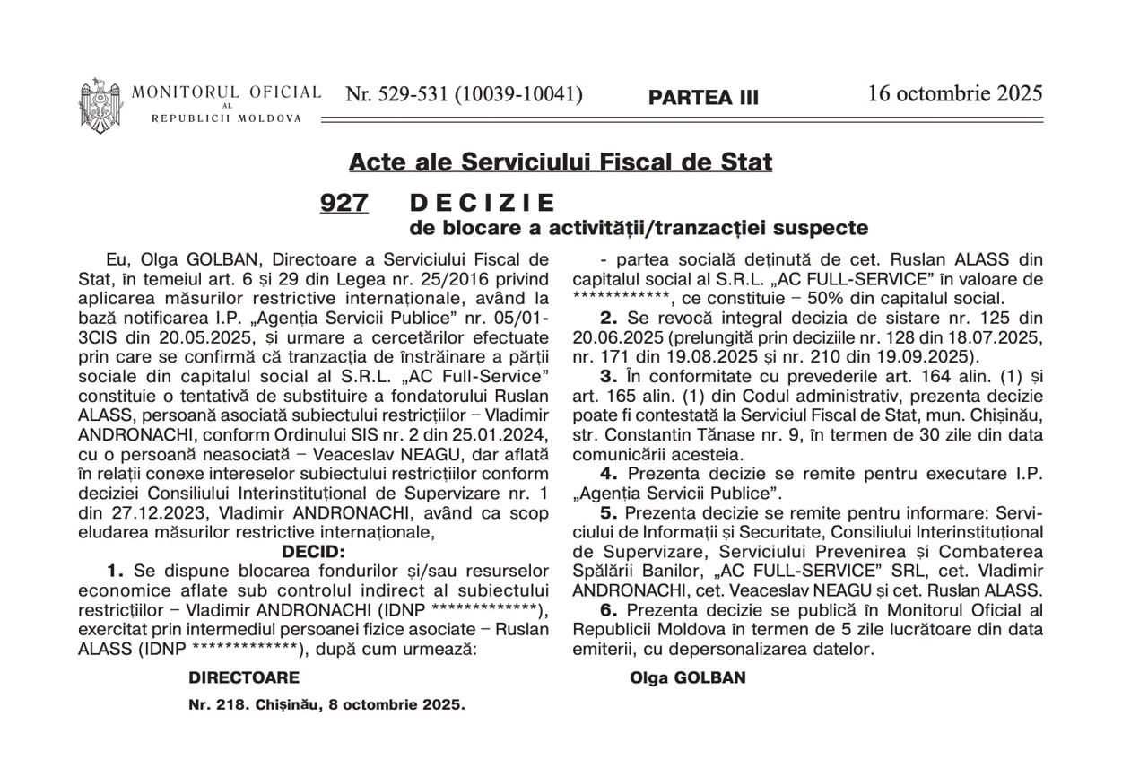 Potrivit documentului, decizia de blocare a fondurilor este aplicată „urmare a cercetărilor prin care se confirmă că tranzacția de înstrăinare a părții sociale din capitalul social al S.R.L. „AC Full-Service” constituie o tentativă de substituire a fondatorului Ruslan Alass, persoană asociată subiectului restricțiilor – Vladimir Andronachi, conform Ordinului Serviciului de Informații și Securitate, cu o persoană neasociată – Veaceslav Neagu, dar aflată în relații conexe intereselor subiectului restricțiilor conform deciziei Consiliului Interinstituțional de Supervizare, Vladimir Andronachi, având ca scop eludarea măsurilor restrictive internaționale”.