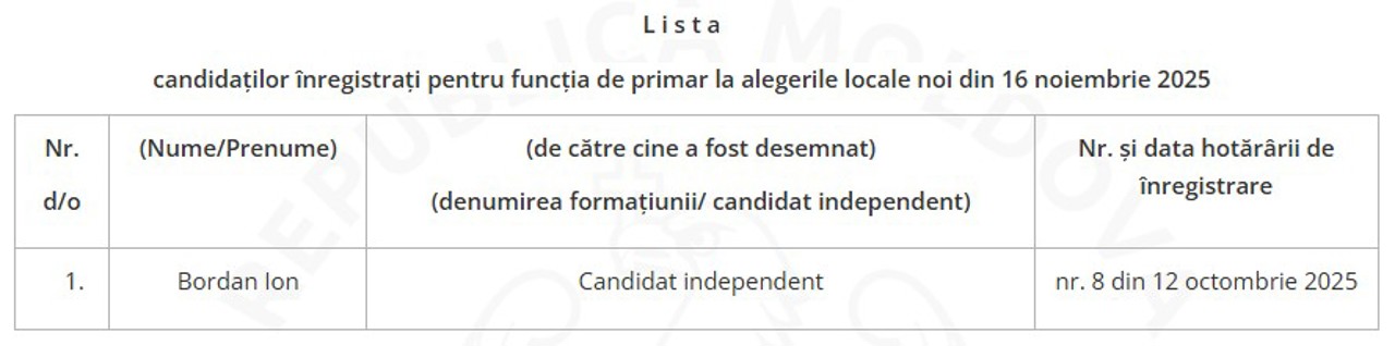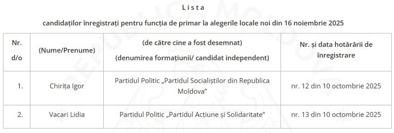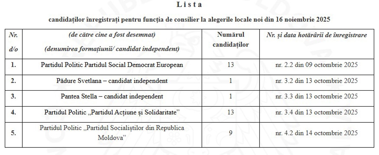 The Action and Solidarity Party and the Socialist Party each have three candidates in the electoral race. The Development and Consolidation Party of Moldova has two candidates, the League of Cities and Communes has one, and the other two are independents.