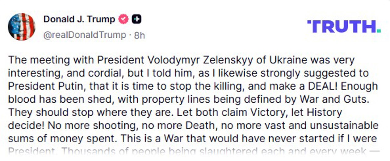 "The meeting with President Volodymyr Zelensky was very interesting and cordial. I told him, as I strongly suggested to President Putin, that it is time to stop the killings and make a deal! Enough blood has been shed, and the borders are defined by war and courage. The parties should stop where they are now. Let both claim victory, let history decide! No more shooting, no more death, no more huge sums of money being spent. This is a war that never should have started if I had been President. Thousands of people are being slaughtered every week - STOP, GO HOME TO YOUR FAMILIES IN PEACE!" Mr Trump wrote.