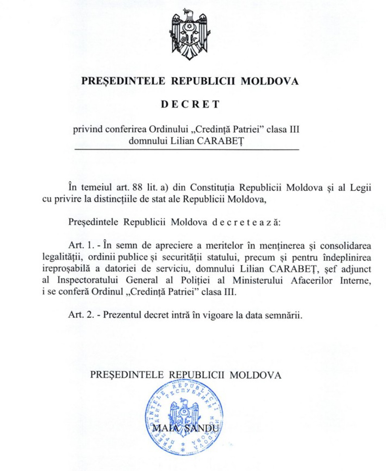 Totodată, adjunctului acestuia, Lilian Carabeț, i-a fost conferit Ordinul „Credință Patriei”, clasa III, în semn de „apreciere a meritelor în menținerea și consolidarea legalității, ordinii publice și securității statului, precum și pentru îndeplinirea ireproșabilă a datoriei de serviciu”.