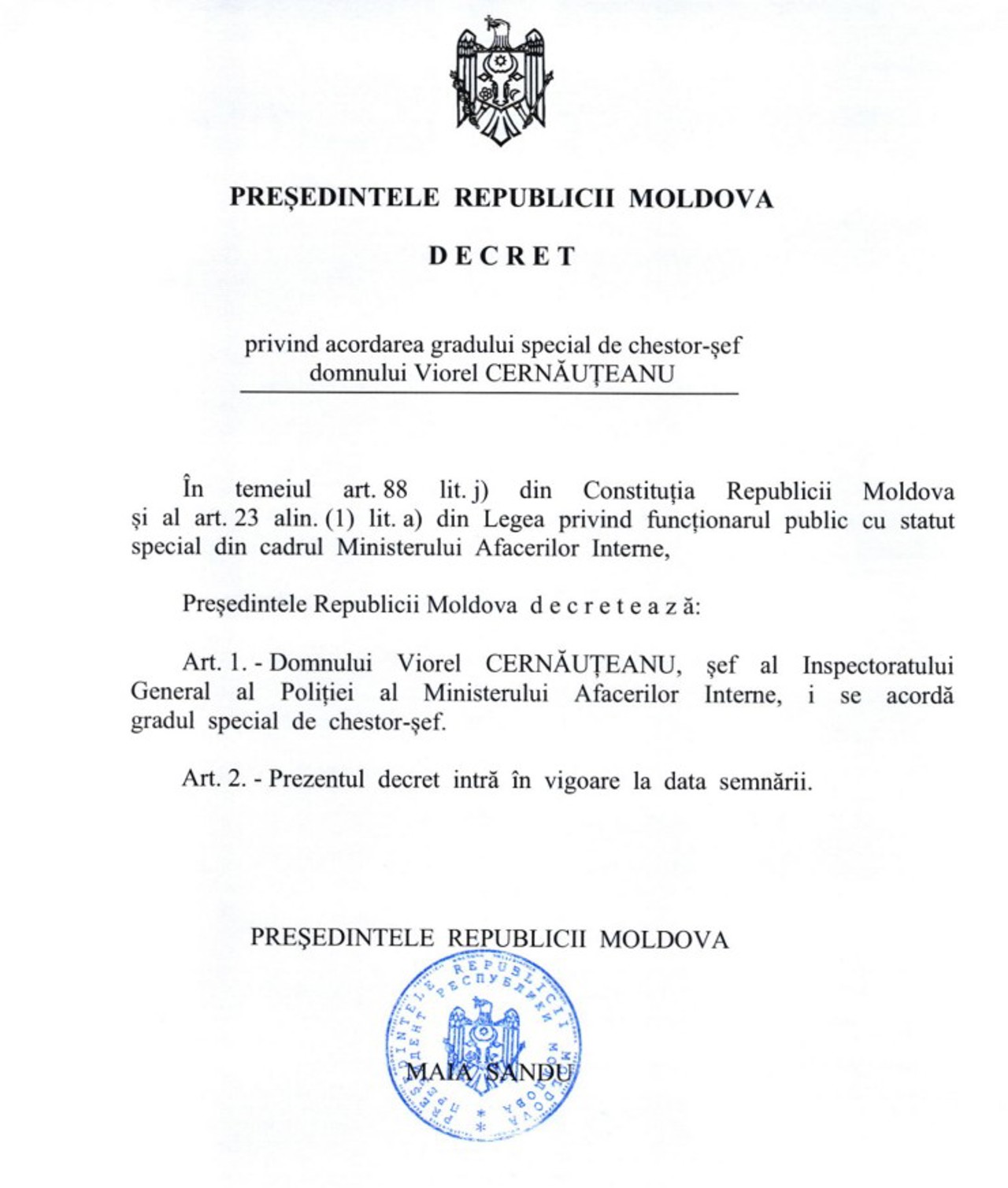 DECRETE | Grad special de chestor-șef pentru Viorel Cernăuțeanu și ordin pentru adjunctul acestuia, acordate de președinta Maia Sandu