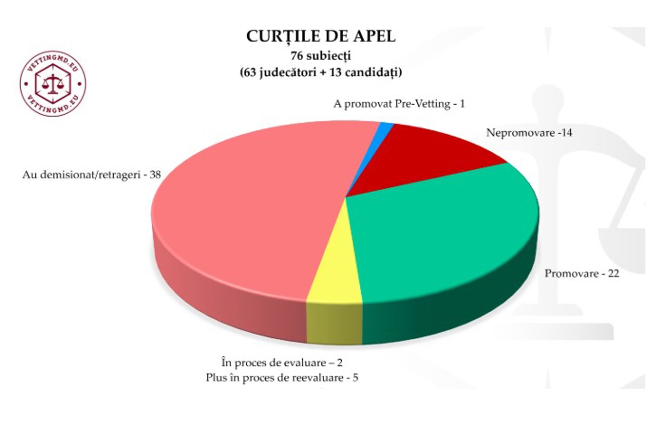 Comisia a notificat, de asemenea, 76 de subiecți, inclusiv 63 de judecători, de la Curțile de Apel, dintre care cei mai mulți – 38 – fie au demisionat, fie s-au retras înainte de a fi supuși vettingului.