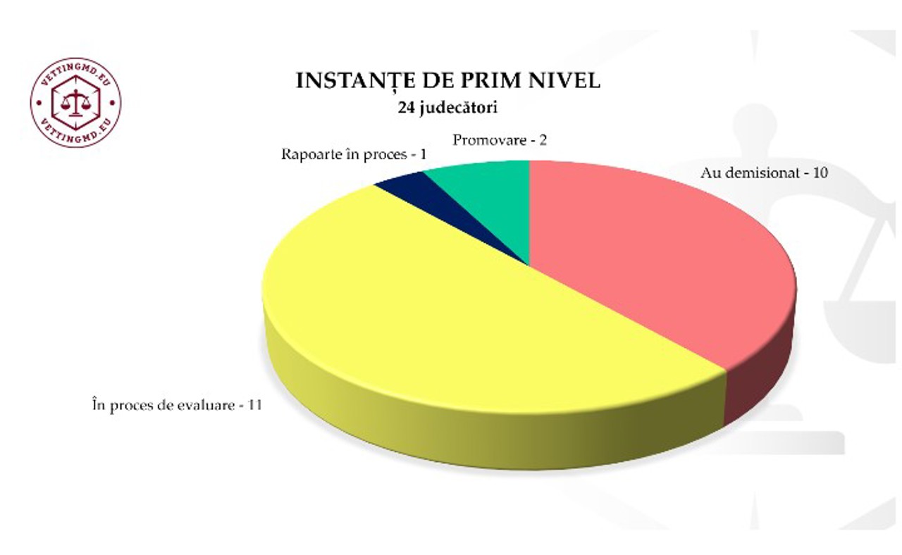Cât privește instanțele de prim nivel, Comisia a notificat în total 24 de judecători, dintre care zece au demisionat imediat, doi au promovat vetting-ul și 11 dosare sunt în proces de evaluare.