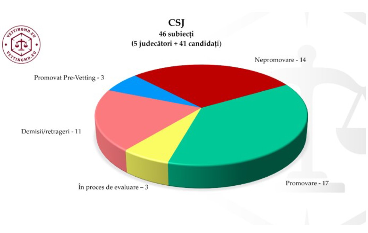În cazul Curții Supreme de Justiție, au fost notificați cinci judecători și 41 de candidați, dintre care 17 au promovat vetting-ul, 14 – nu, iar în cazul altor trei continuă procesul de evaluare.