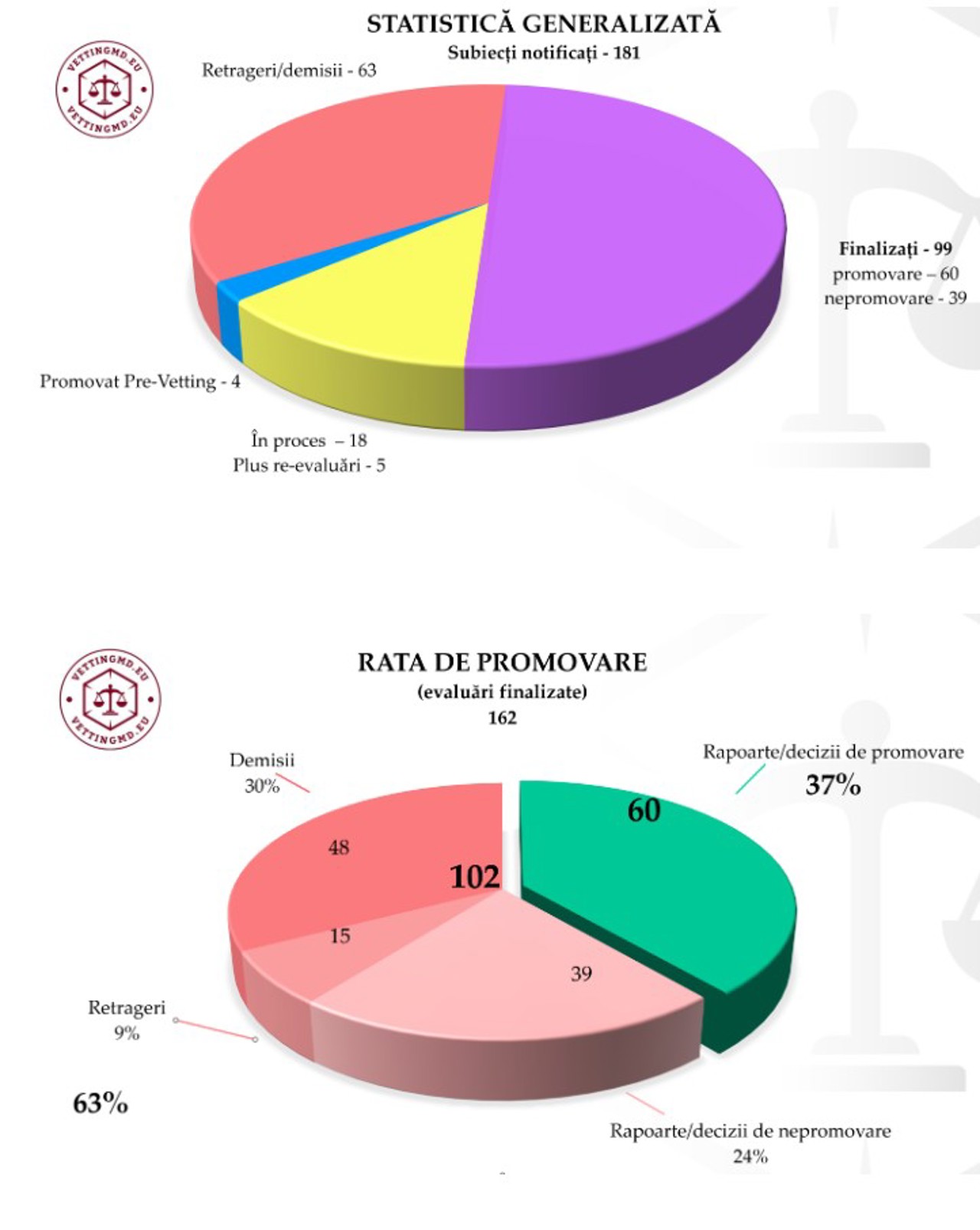 Comisia de Evaluare a Judecătorilor a notificat, până la finele lunii octombrie curent, 181 de judecători și candidați la funcții din sistem, însă 63 dintre aceștia sau 39% fie au demisionat, fie s-au retras înainte de a fi supuși vetting-ului.