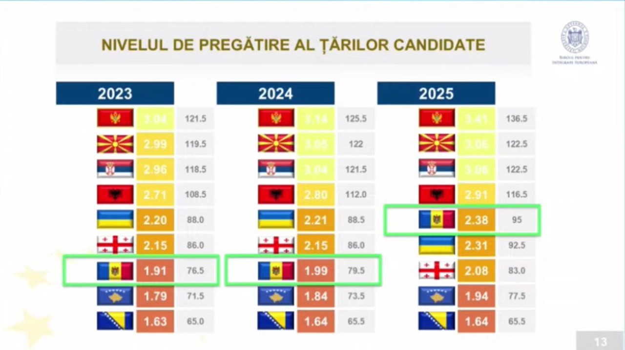 „Am avansat în clasamentul țărilor candidate de la poziția 7 în 2023 și 2024, la un scor mediu de 2,38 în 2025, ceea ce ne-a permis să devansăm Ucraina și alte țări cu experiență mai bogată”, a precizat Crudu, adăugând că „suntem la jumătate de cale, pentru a închide negocierile avem nevoie de nivelul 5, nivelul avansat”.