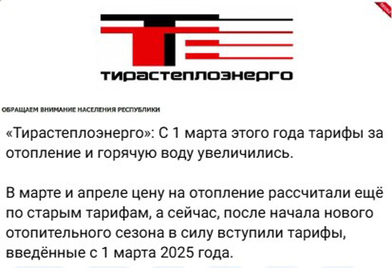 The new Tiraspol tariffs, introduced by local supplier "Tirasteploenergo" and effective March 1, 2025, have only just been applied with the onset of the new heating season.