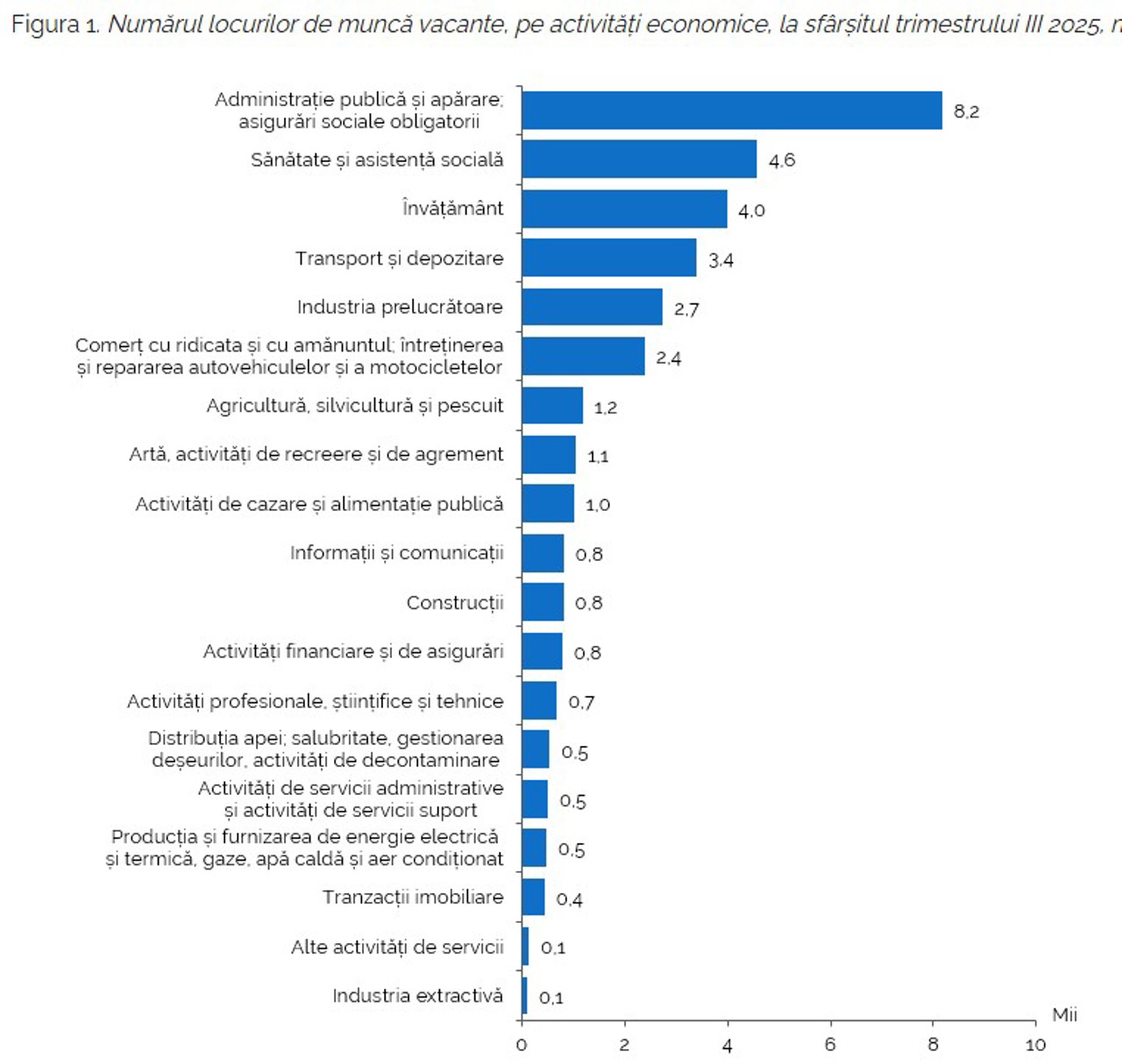 Conform datelor prezentate de BNS, cele mai multe posturi vacante au fost în administrație publică, apărare, asigurări sociale obligatorii - numărul acestora fiind de peste opt mii, sănătate și asistență socială - 4.6 mii de posturi vacante, în învățământ numărul fiind de patru mii de locuri de muncă.